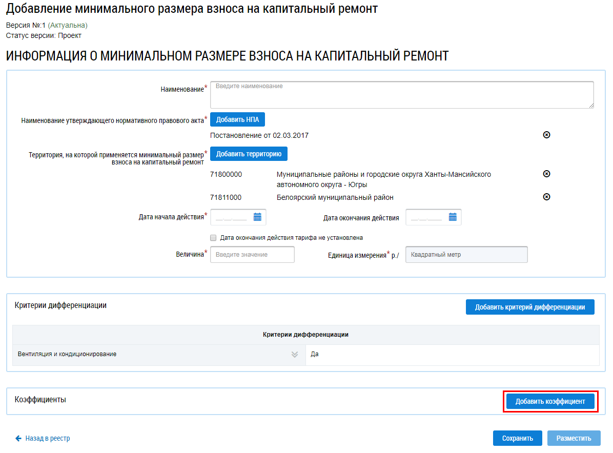 Чтобы добавить коэффициент нажмите на кнопку Добавить коэффициент.