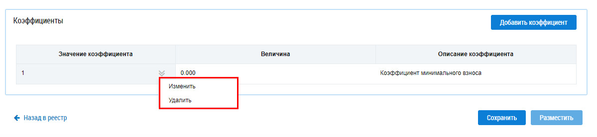 Для удаления коэффициента раскройте контекстное меню и выберите пункт Удалить.