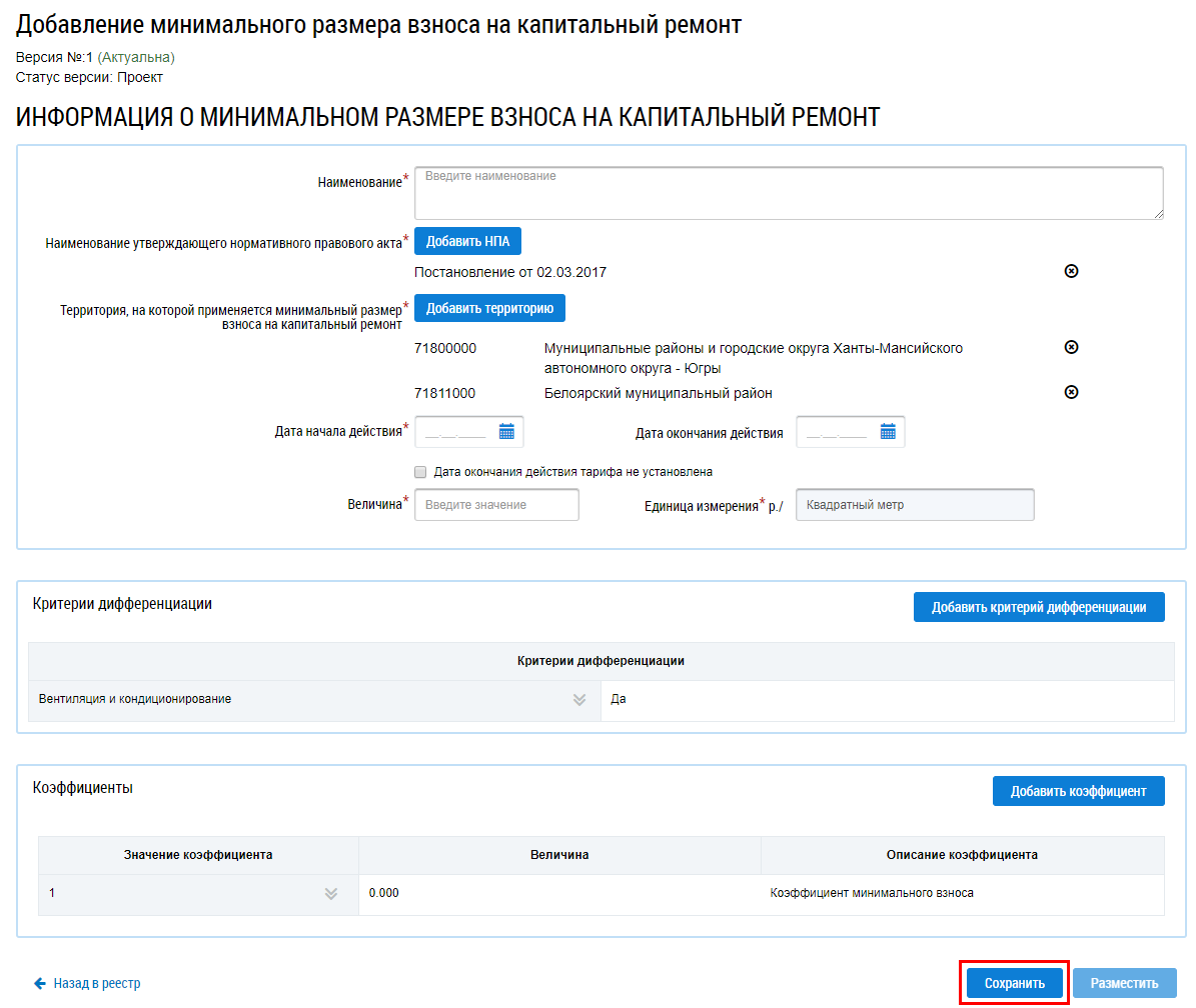Для завершения процедуры создания информации о минимальном размере взноса на капитальный ремонт нажмите на кнопку Сохранить.