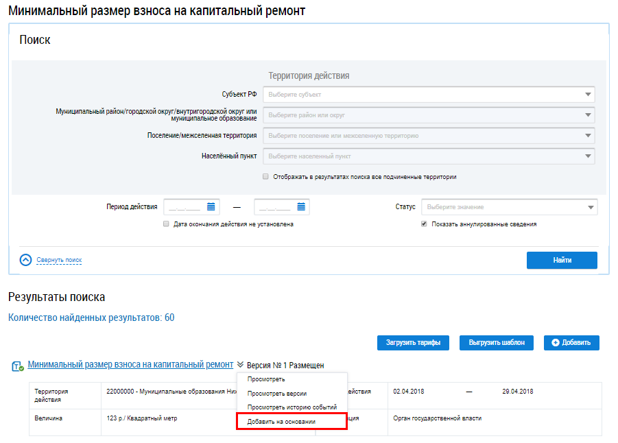 Чтобы добавить минимальный размер взноса на капитальный ремонт на основании ранее размещенной информации, раскройте контекстное меню и выберите пункт Добавить на основании.