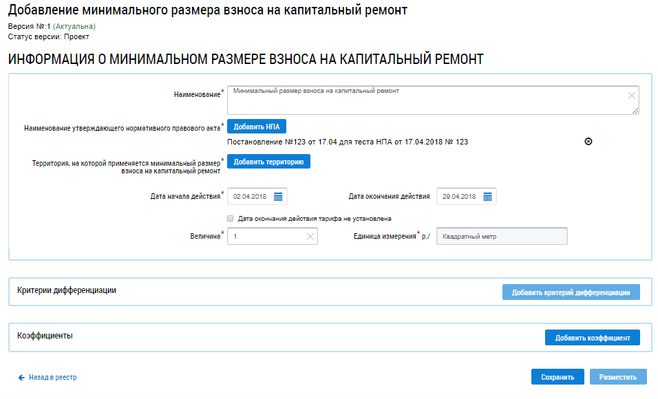 Далее отображается страница Добавление минимального размера взноса на капитальный ремонт.