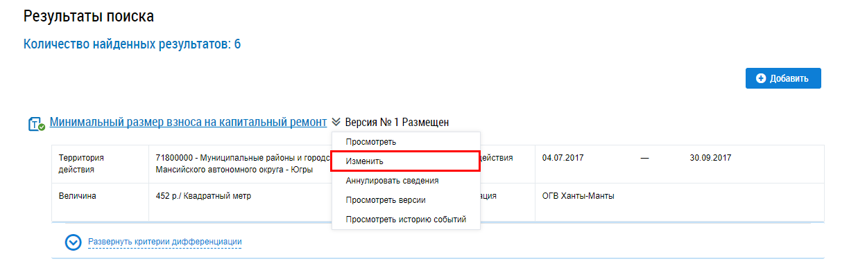 Для изменения минимального размера взноса на капитальный ремонт выберите пункт контекстного меню Изменить.