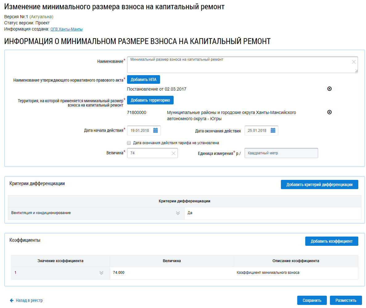 Отображается страница Изменение минимального размера взноса на капитальный ремонт.