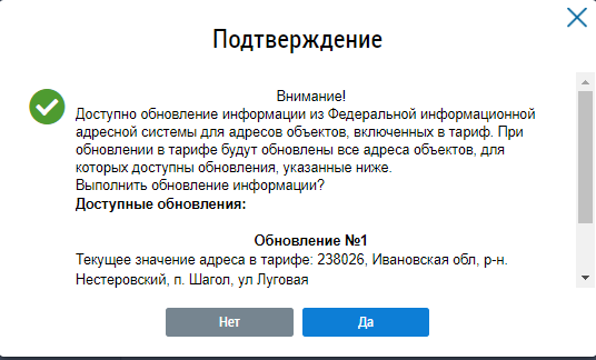 Если Системой найдено обновление адреса объекта жилищного фонда, отображается следующее окно подтверждения.