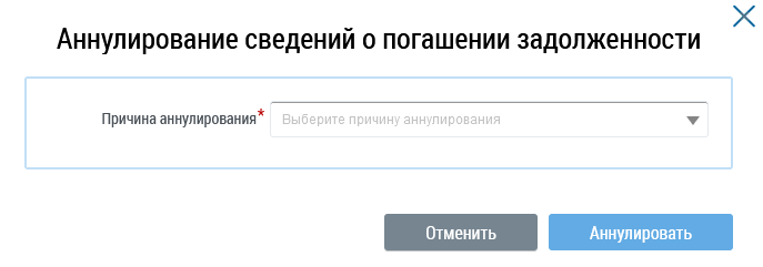 Подтвердите действие. В отобразившемся окне Аннулирование сведений о погашении задолженности укажите причину аннулирования. Нажмите на кнопку Аннулировать.