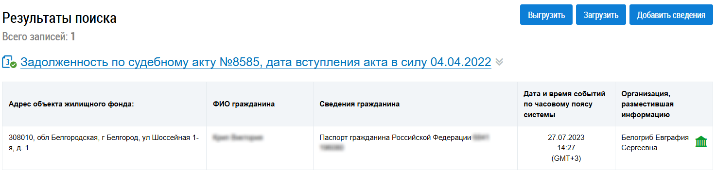 - Дата вступления в силу судебного акта. Это поле обязательно для заполнения. Для поиска сведений необходимо указать период даты вступления в силу судебного акта длительностью не более трех лет. При размещении сведений о задолженности может возникать ошибка. Для поиска сведений с ошибками размещения установите флажок Поиск сведений с ошибками размещения.