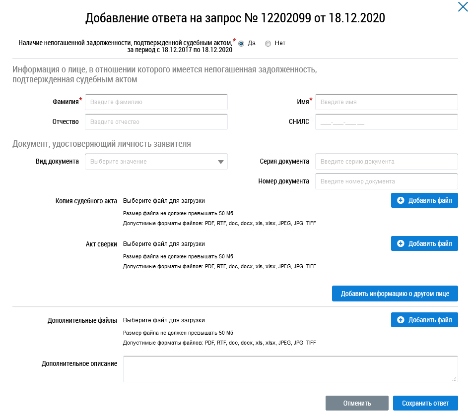 Укажите информацию о лице, в отношении которого имеется непогашенная задолженность, подтвержденная судебным актом. Укажите данные документа, удостоверяющего личность заявителя. Прикрепите копию судебного акта и акт сверки. При необходимости добавьте информацию о другом лице и прикрепите дополнительные файлы. Сохраните ответ.