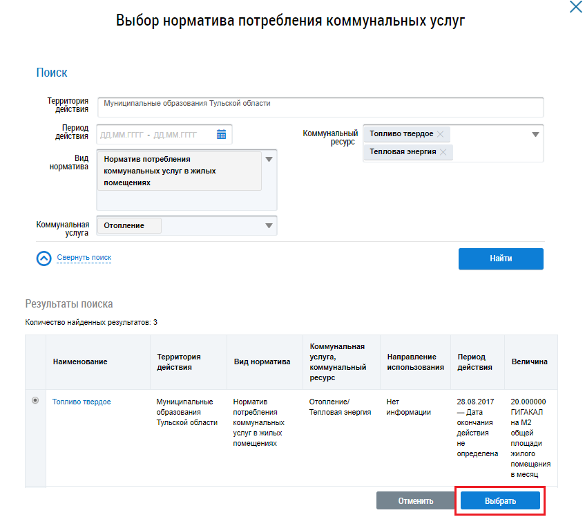 Отображается окно Выбор норматива потребления коммунальных услуг.