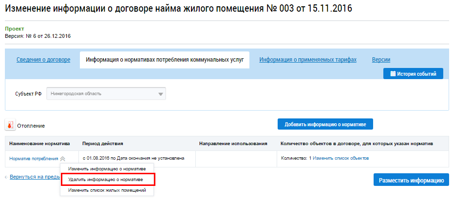 Для удаления информации о нормативе потребления коммунальных услуг выберите пункт контекстного меню Удалить информацию о нормативе.
