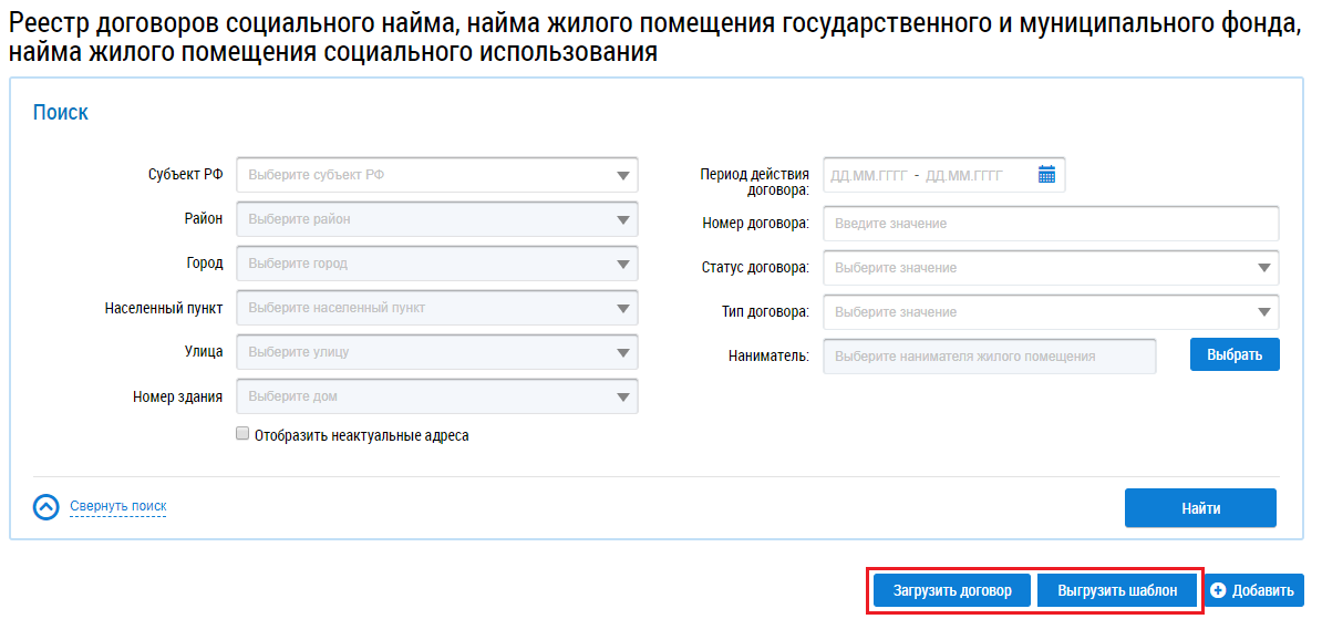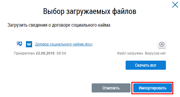 Чтобы импортировать сведения о договоре социального найма, нажмите на кнопку Загрузить договор.