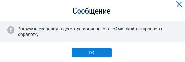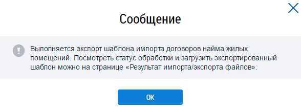 Выполняется экспорт шаблона импорта договоров найма жилых помещений. Посмотреть статус обработки и загрузить экспортированный шаблон можно на странице Реестр статусов обработки файлов.