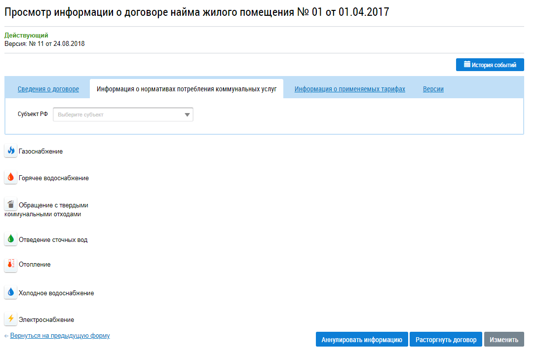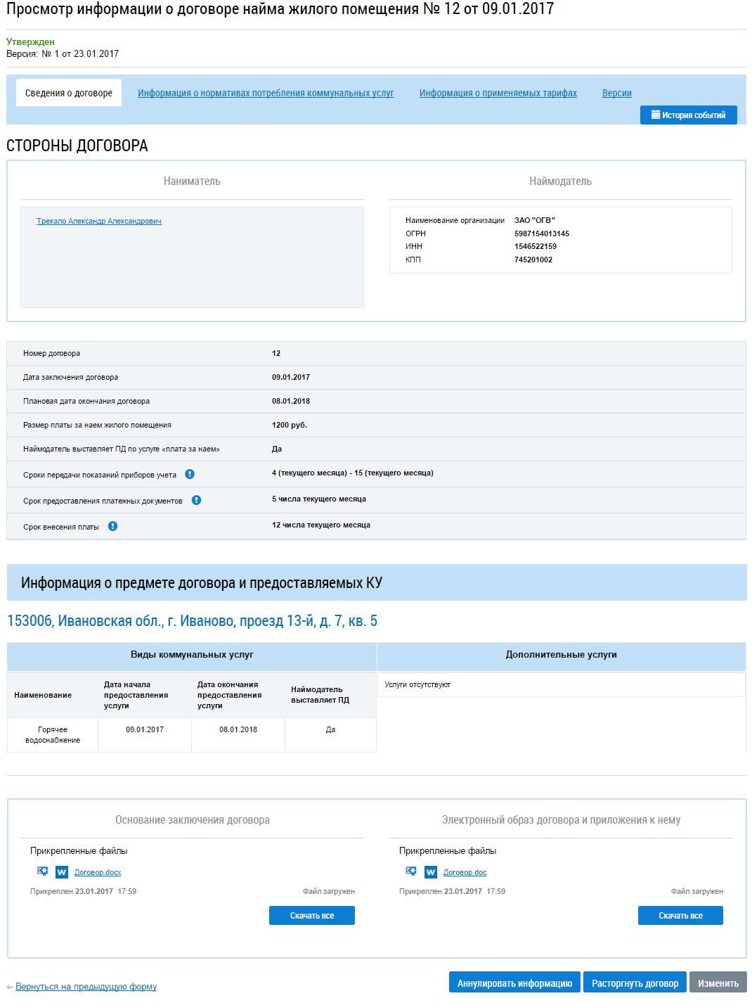 Отображается страница Просмотр информации о договоре найма жилого помещения.