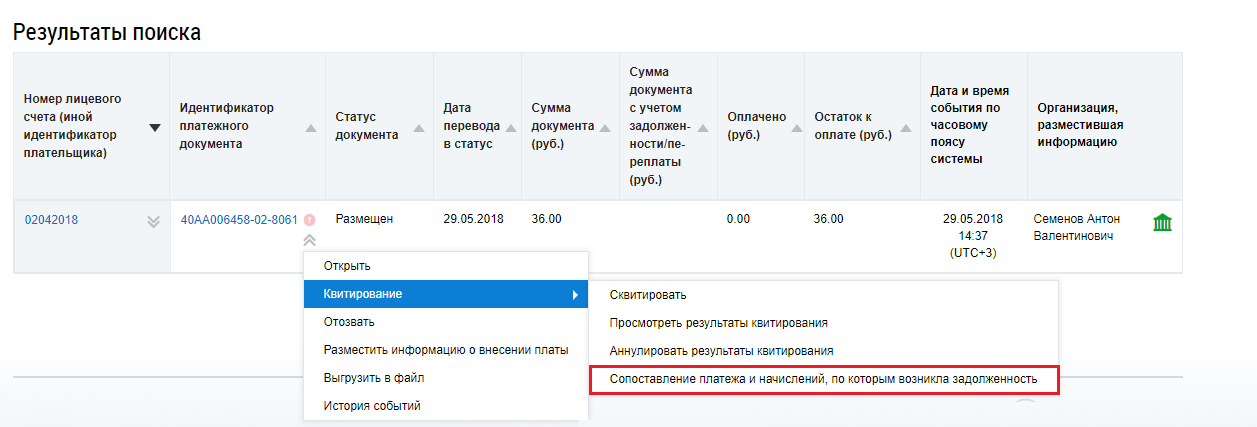 Для сопоставления платежа и начислений, по которым возникла задолженность, раскройте контекстное меню и выберите пункт Квитирование и затем подпункт Сопоставление платежа и начислений, по которым возникла задолженность для платежного документа в статусе Размещен.