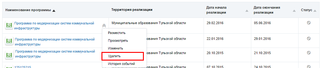 Для удаления информации о региональной программе по модернизации систем коммунальной инфраструктуры раскройте контекстное меню и выберите пункт Удалить.