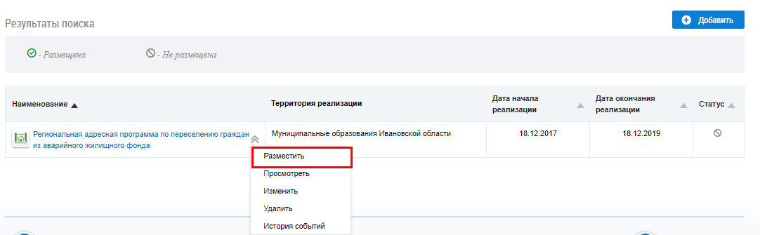 Для размещения информации о региональной адресной программе по переселению граждан из аварийного жилищного фонда раскройте контекстное меню и выберите пункт Разместить (Пункт контекстного меню «Разместить») или на карточке добавления информации о региональной адресной программы по переселению граждан из аварийного жилищного фонда нажмите на кнопку Разместить (Вкладка «Документы программы». Кнопка «Добавить документ»).