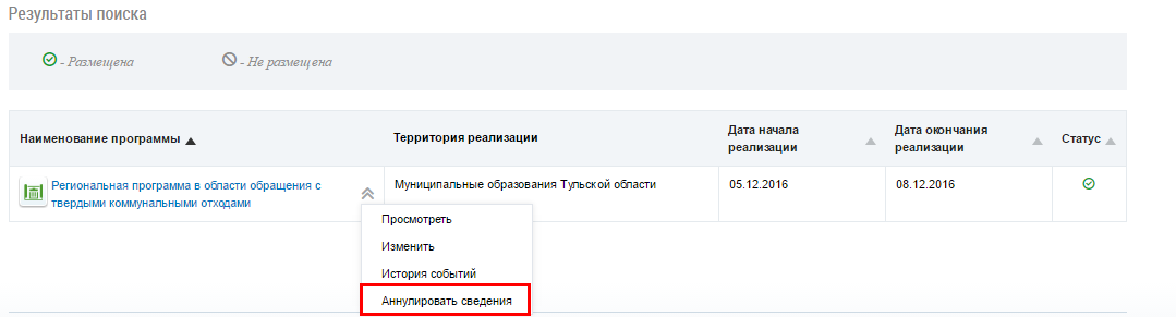 Для аннулирования сведений о региональной программе в области обращения с твердыми коммунальными отходами раскройте контекстное меню и выберите пункт Аннулировать сведения.