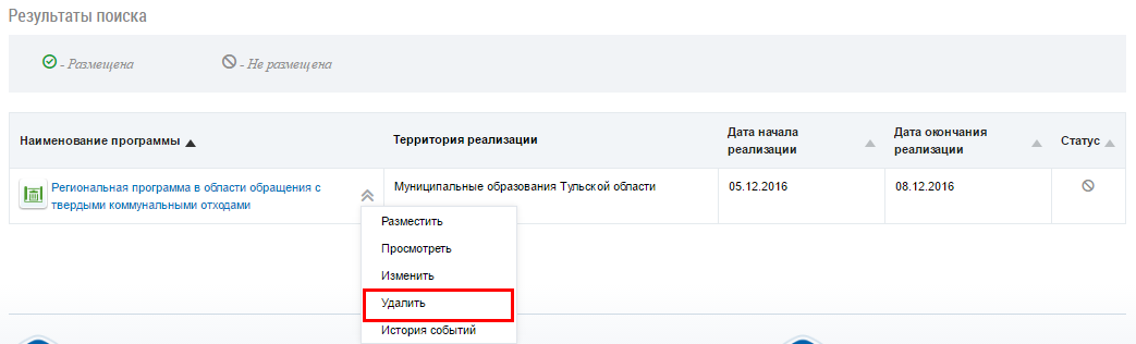 Для удаления региональной программы в области обращения с твердыми коммунальными отходами раскройте контекстное меню и выберите пункт Удалить.