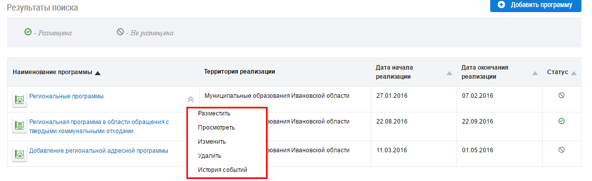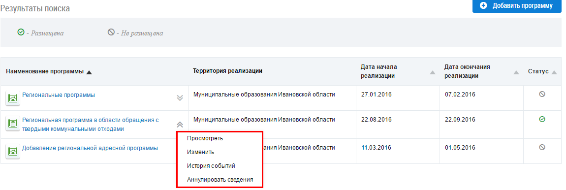 Для изменения информации о региональной программе в области обращения с твердыми коммунальными отходами раскройте контекстное меню и выберите пункт Изменить.