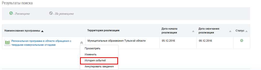 Для просмотра истории событий раскройте контекстное меню и выберите пункт История событий.