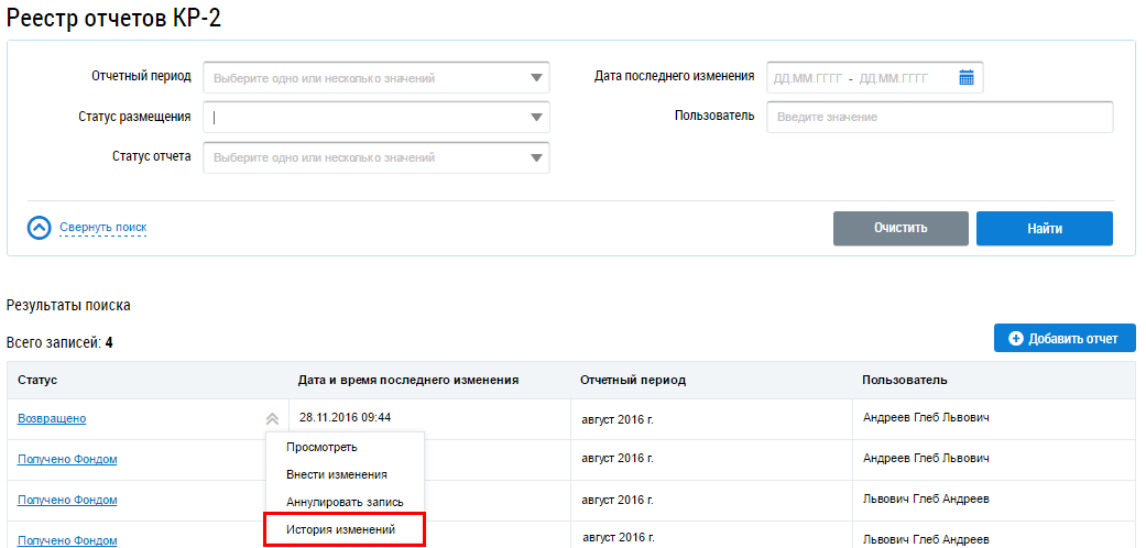 Для просмотра истории изменений выберите пункт контекстного меню История изменений.