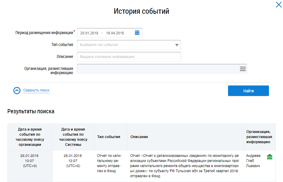 Отображается окно История событий.