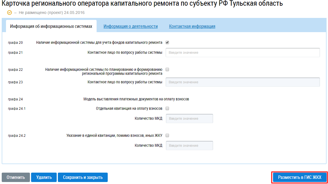 Чтобы разместить отчет в ГИС ЖКХ нажмите на кнопку Разместить в ГИС ЖКХ на странице создания/изменения отчета.