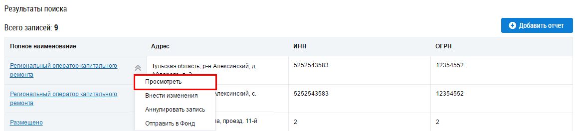 Чтобы просмотреть подробную информацию об отчете нажмите на гиперссылку с наименованием статуса отчета или выберите пункт контекстного меню Просмотреть.