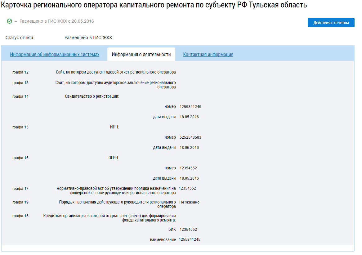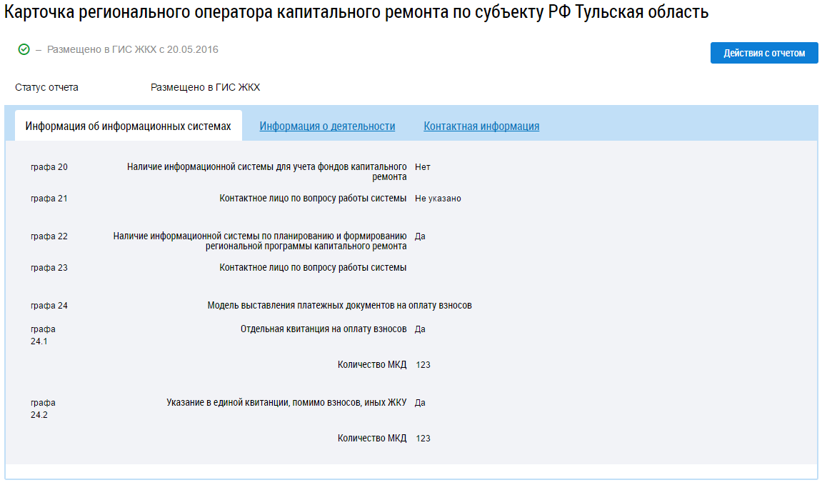 Отображается страница Карточка регионального оператора капитального ремонта по субъекту РФ Тульская область на вкладке Информация об информационных системах, которая включает блоки информации о наличии информационных систем и методе выставления платежных документов на оплату взносов.