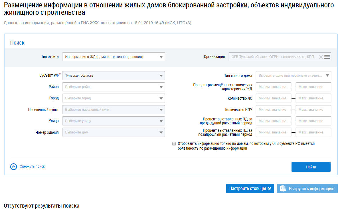 Для перехода на страницу Размещение информации в отношении жилых домов блокированной застройки, объектов индивидуального жилищного строительства установите переключатель Преднастроенные отчеты. Выберите необходимый вид отчета из выпадающего списка и нажмите на кнопку Найти. Затем нажмите на гиперссылку с наименованием отчета Размещение информации по жилым домам.