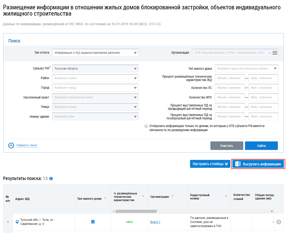 Чтобы выгрузить информацию по ЖД, нажмите на кнопку Выгрузить информацию на странице Размещение информации в отношении жилых домов блокированной застройки, объектов индивидуального жилищного строительства.