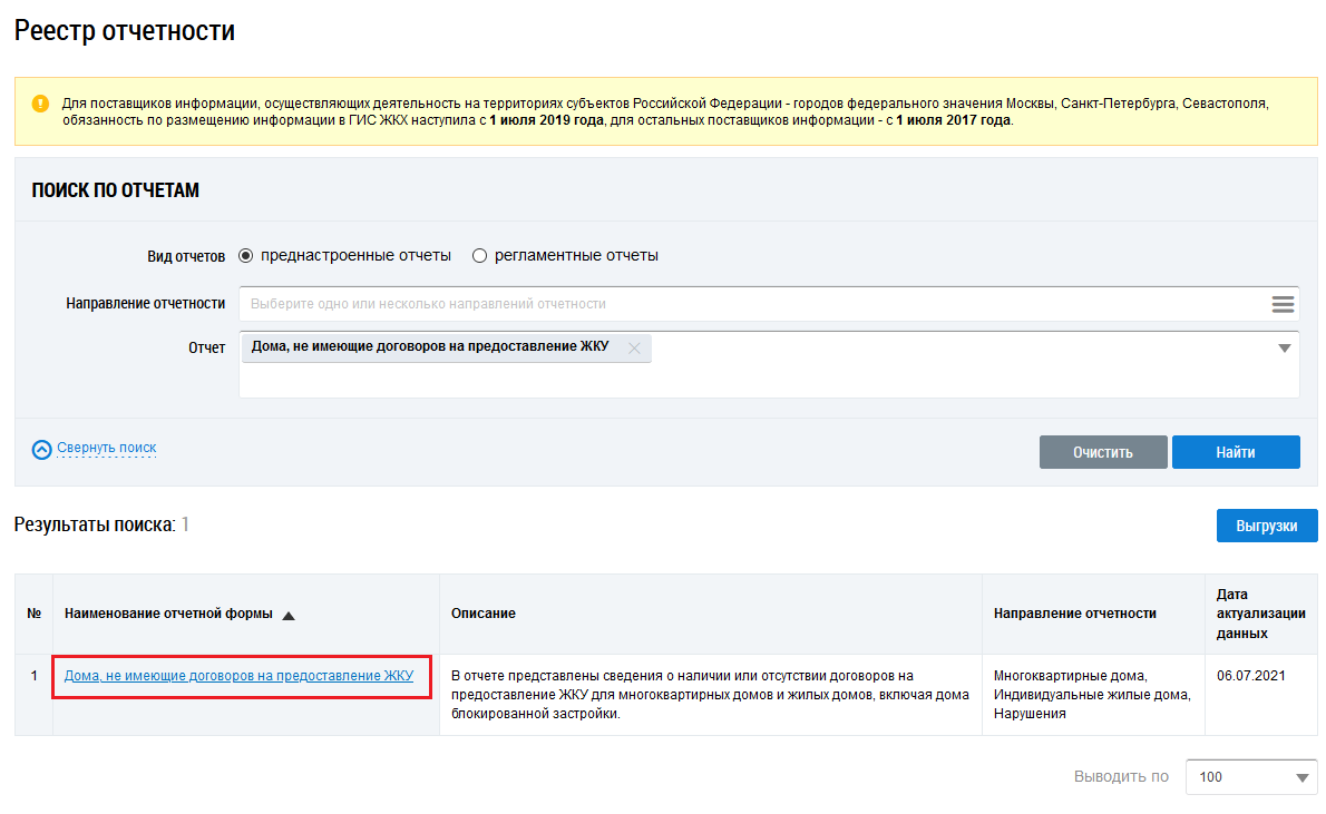 Рис. 1. Страница «Реестр отчетности». Гиперссылка «Дома, не имеющие договоров на предоставление ЖКУ»