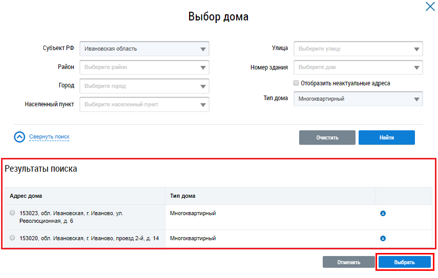 Установите переключатель напротив адреса дома и нажмите на кнопку Выбрать.