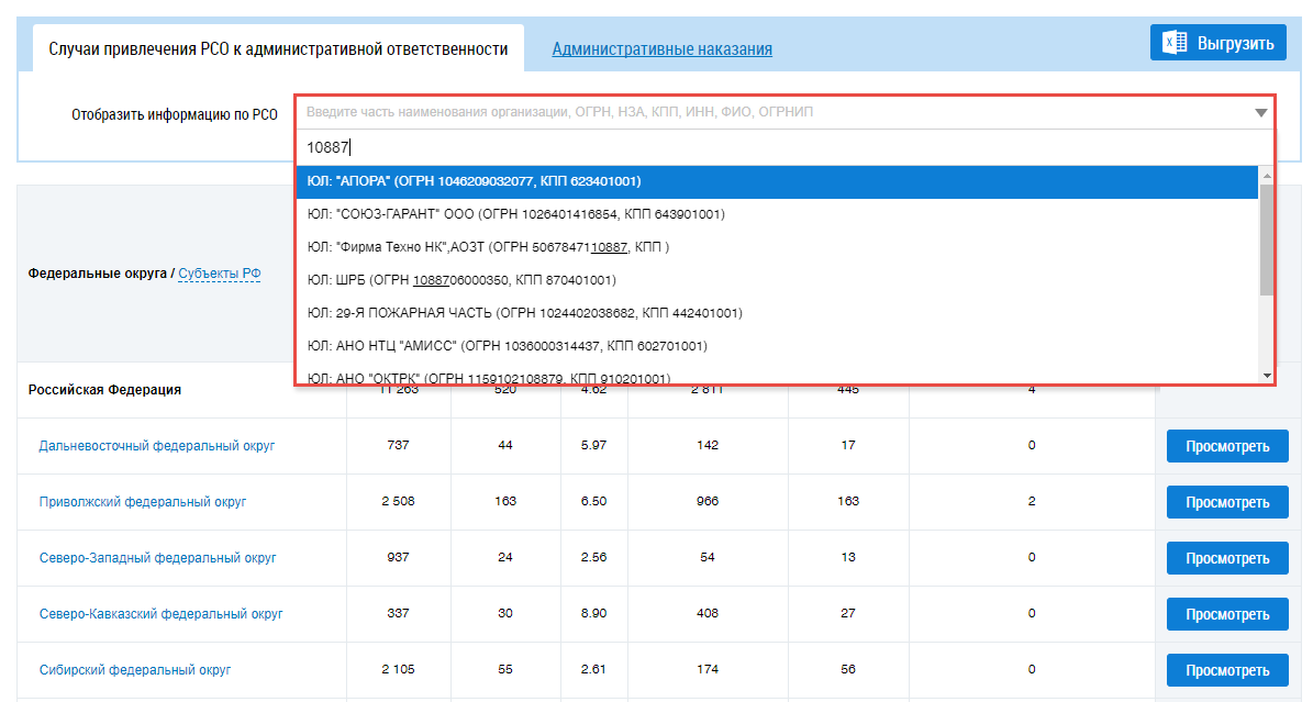 Для отображения информации об организации в таблице в поле «Отобразить информацию по РСО» введите фрагмент названия, ОГРН, НЗА, КПП, ИНН, ФИО или ОГРНИП . Поисковый запрос должен содержать не менее пяти символов. Данный фильтр ищет информацию как в таблице Случаи привлечения РСО к административной ответственности, так и в таблице Административные наказания.