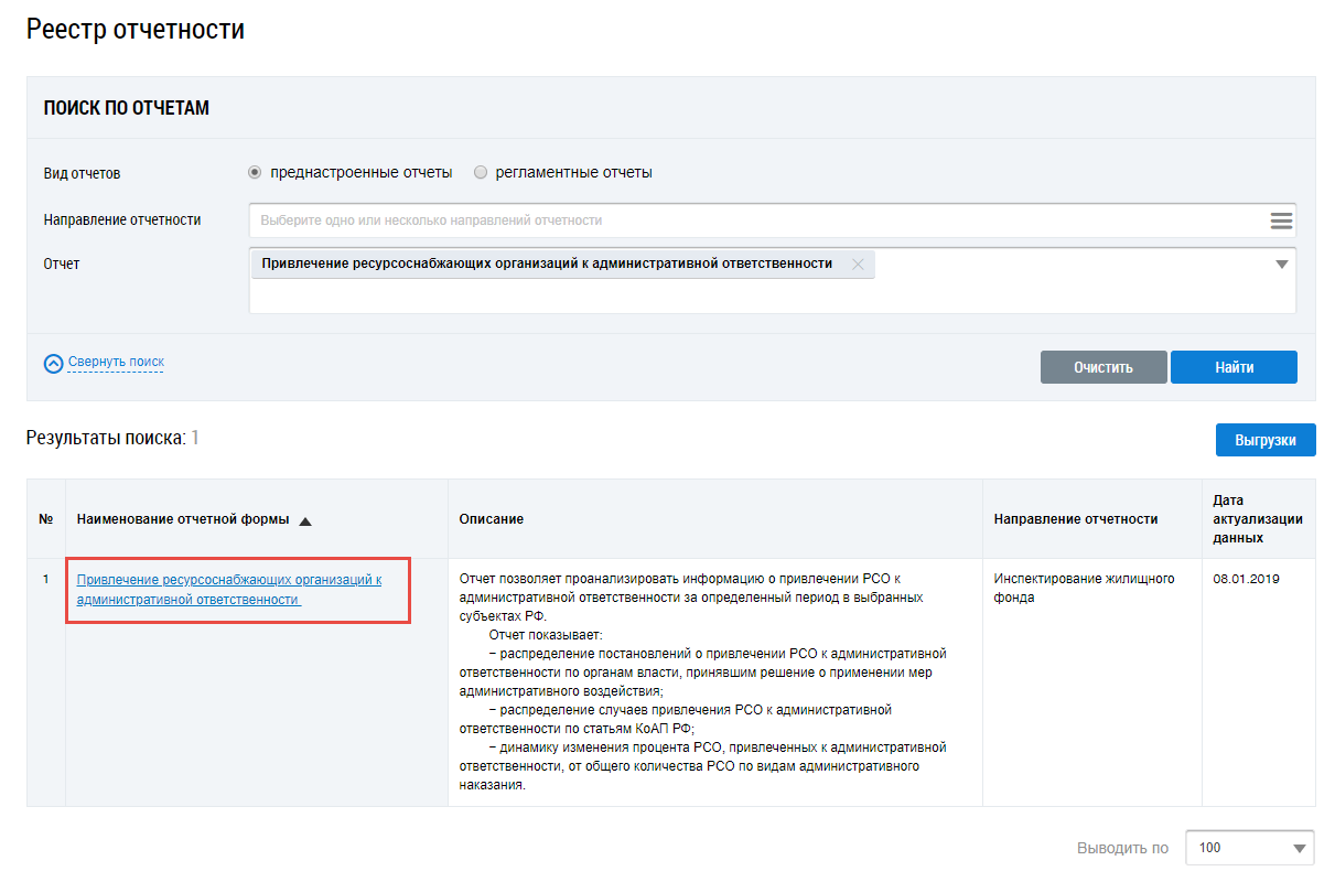 Для перехода на страницу Привлечение ресурсоснабжающих организаций к административной ответственности установите переключатель Преднастроенные отчеты (см. Раздел меню «Аналитика и отчеты»). Затем нажмите на гиперссылку с наименованием отчета Привлечение ресурсоснабжающих организаций к административной ответственности.