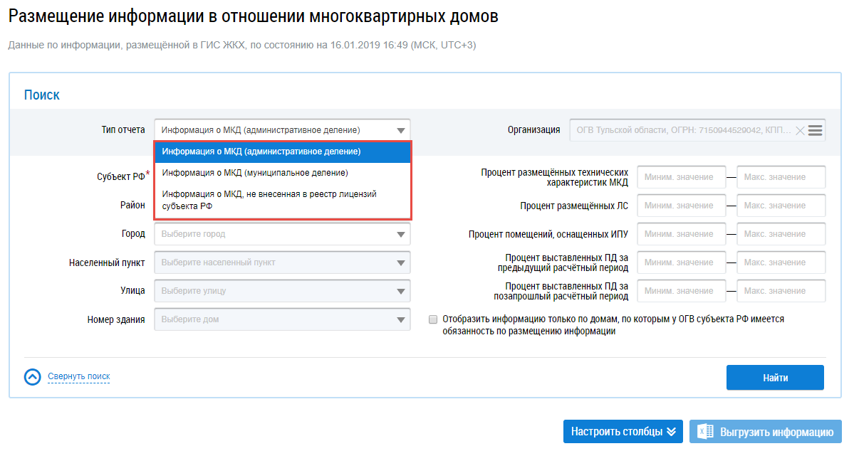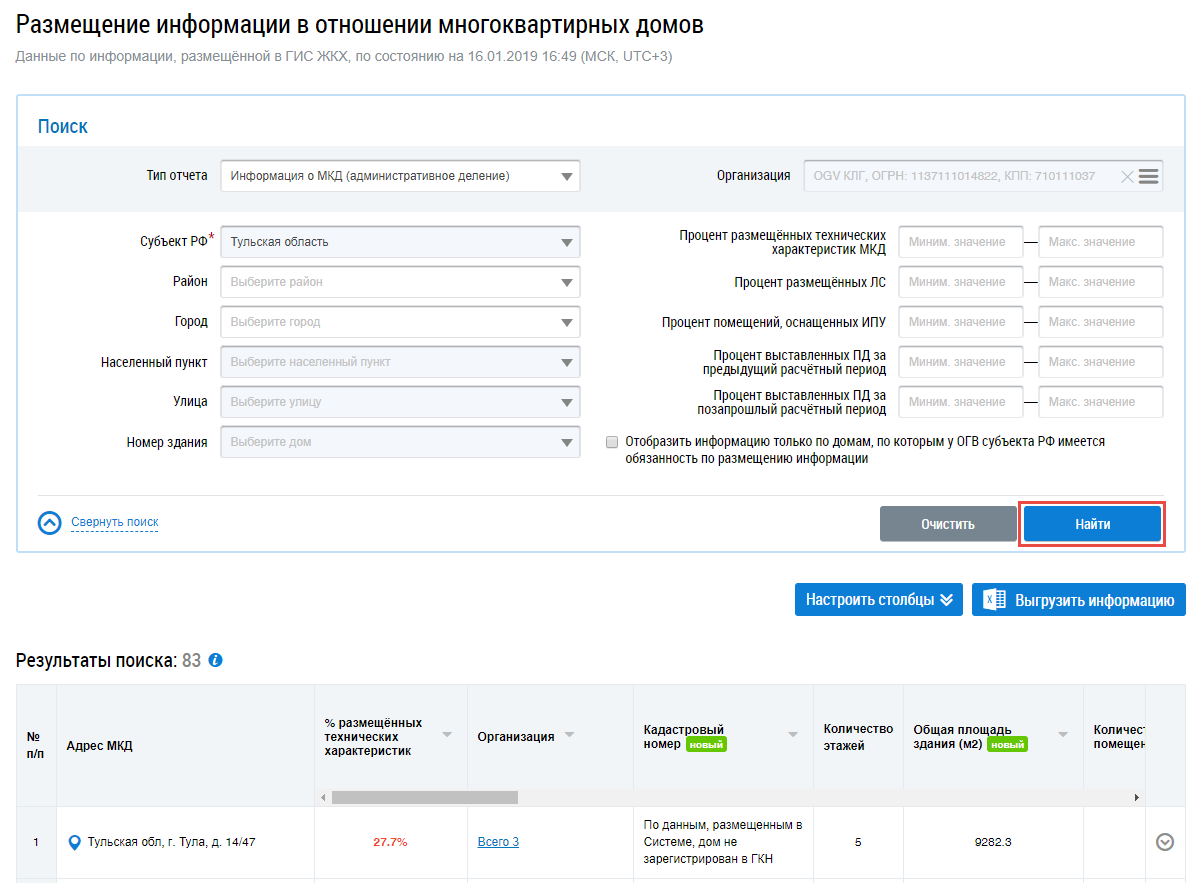 При необходимости поставьте флажок в поле Отобразить информацию только по домам, по которым у ОГВ субъекта РФ имеется обязанность по размещению информации.