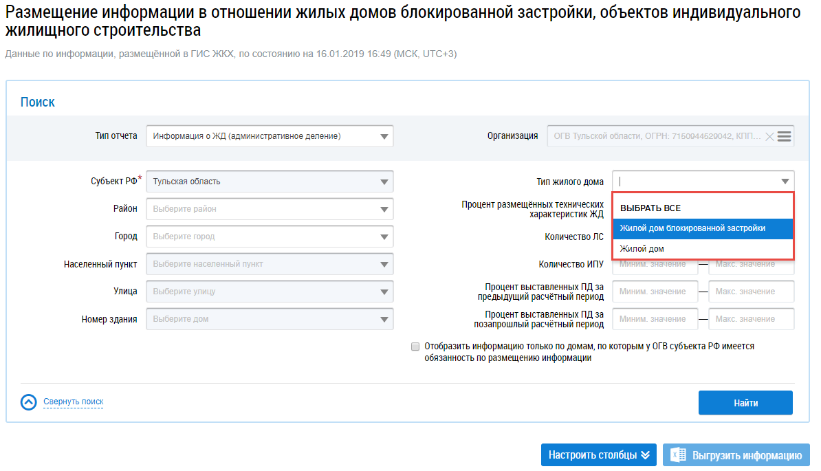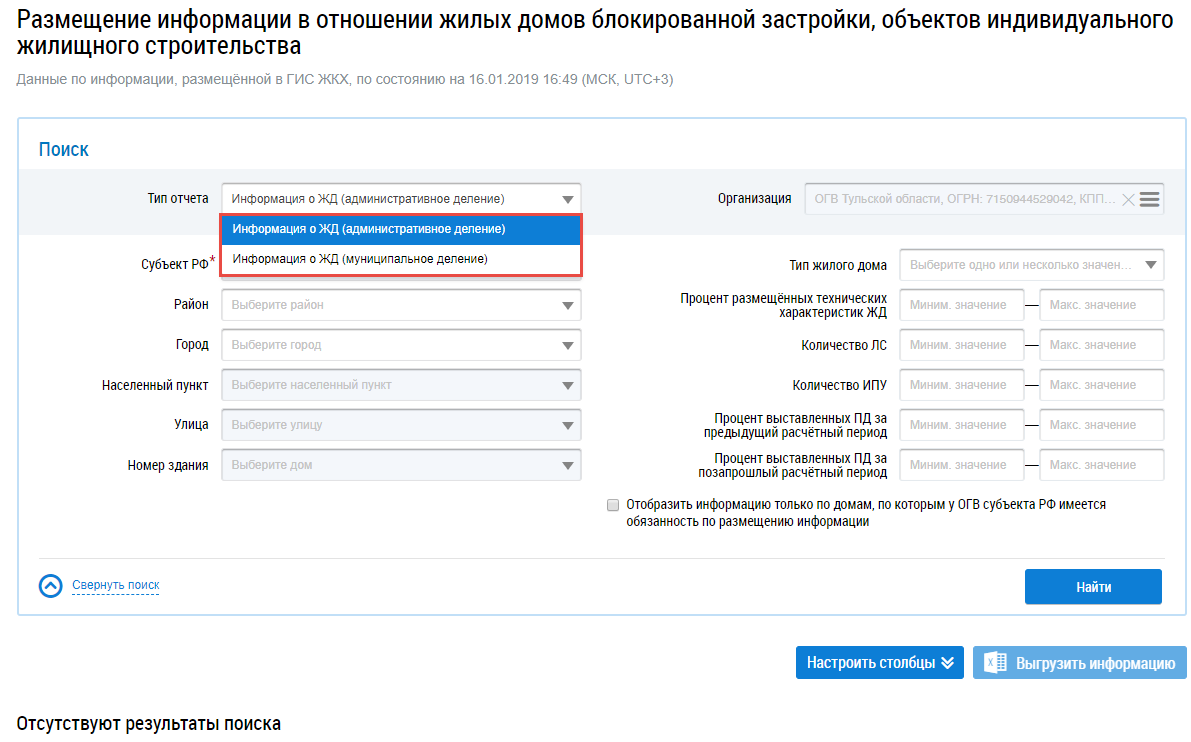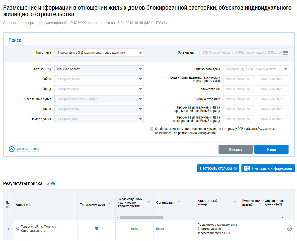 При необходимости поставьте флажок в поле Отобразить информацию только по домам, по которым у ОГВ субъекта РФ имеется обязанность по размещению информации.