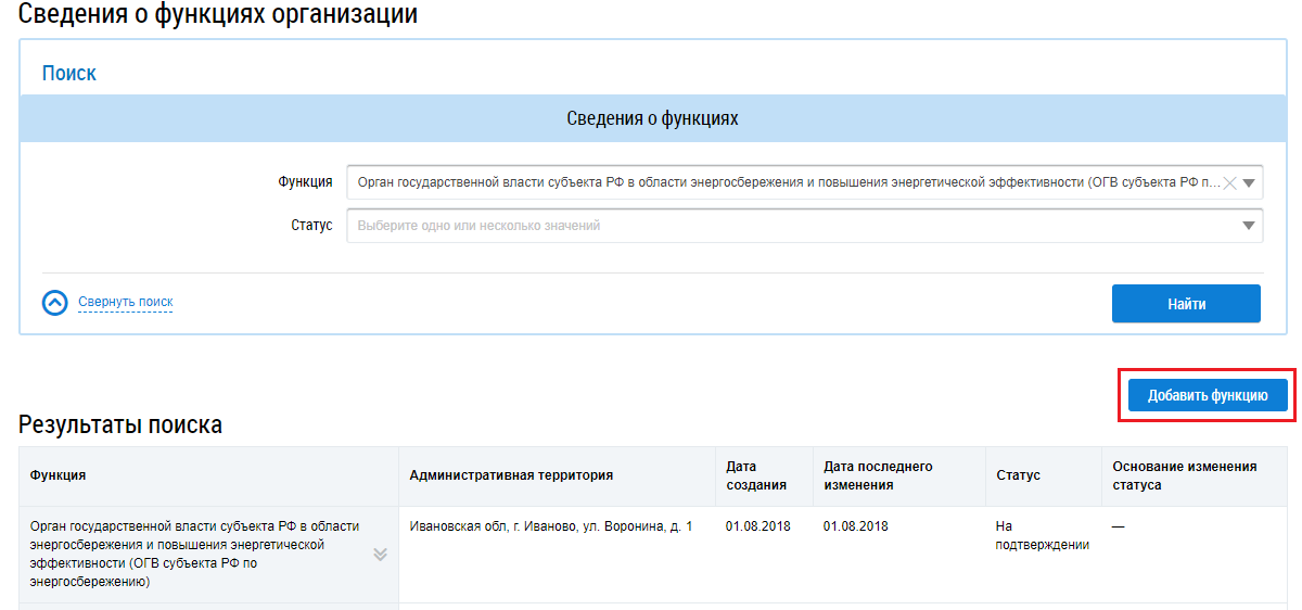 Рис. 1. Страница «Сведения о функциях организации». Кнопка «Добавить функцию»