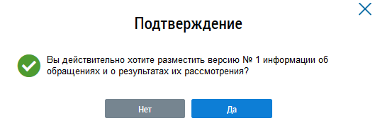 Для подтверждения размещения информации нажмите на кнопку Да, для отмены операции – Нет. При подтверждении отображается сообщение об успешном размещении информации об обращениях и результатах их рассмотрения.