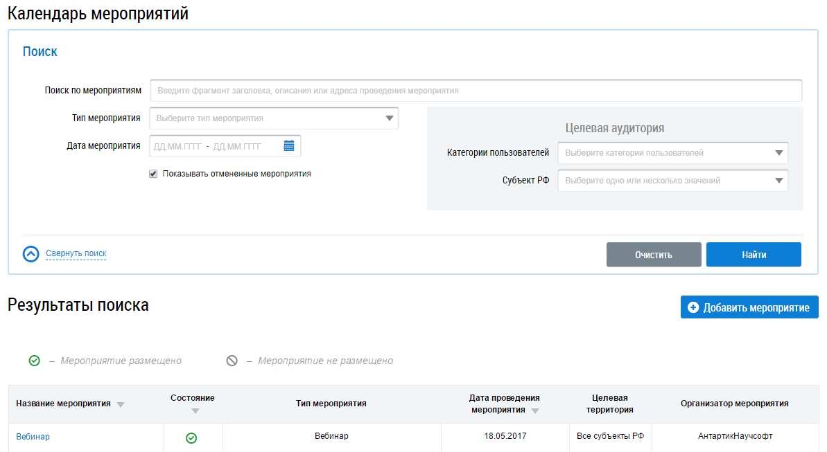 Создание, изменение, размещение, отмена размещения и удаление записей о мероприятиях на сайте ГИС ЖКХ доступно пользователям с правом доступа «Работа с мероприятиями».