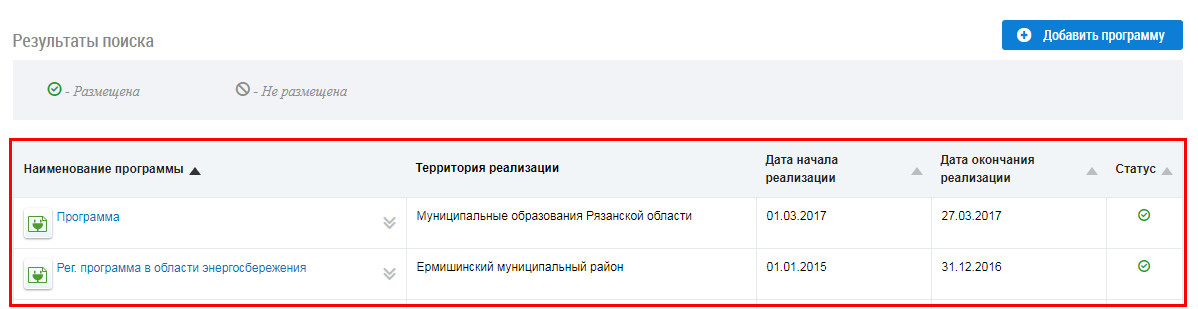 В блоке результатов поиска отображаются программы, соответствующие установленным параметрам поиска.