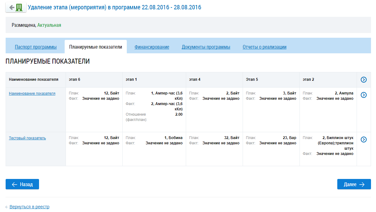 Для просмотра информации о планируемых показателях нажмите на соответствующую вкладку или нажмите на кнопку Далее.