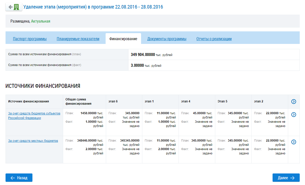 Для просмотра информации об источниках финансирования нажмите на соответствующую вкладку или нажмите на кнопку Далее.