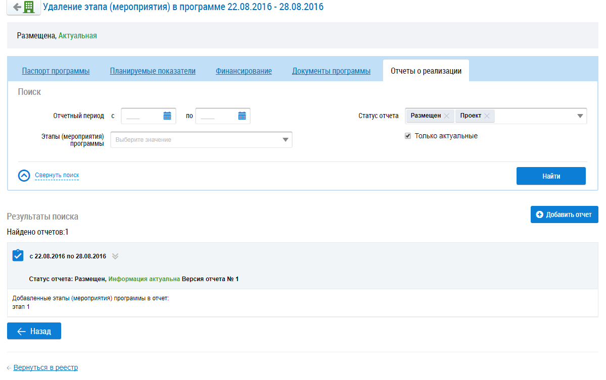 Для просмотра информации об отчетах реализации нажмите на соответствующую вкладку или нажмите на кнопку Далее.