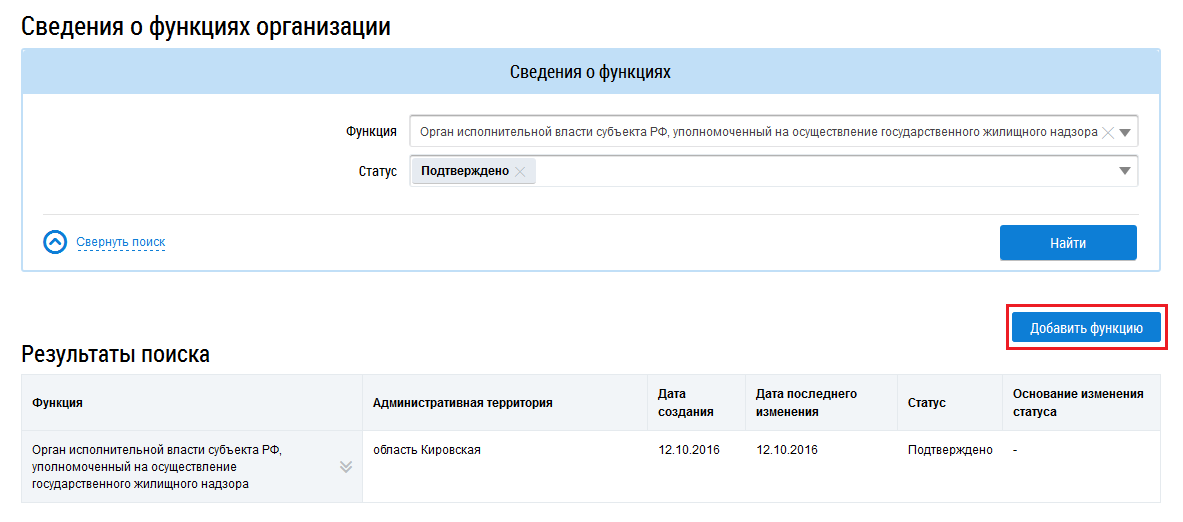 Для добавления функции организации нажмите на кнопку Добавить функцию на странице Сведения о функциях организации.