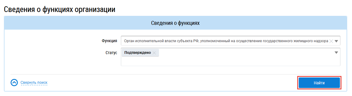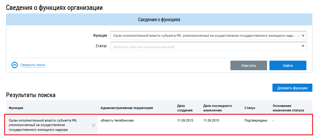 Для заполнения полей Функция и Статус следует выбрать значения из выпадающих списков. После ввода параметров поиска нажмите кнопку Найти.