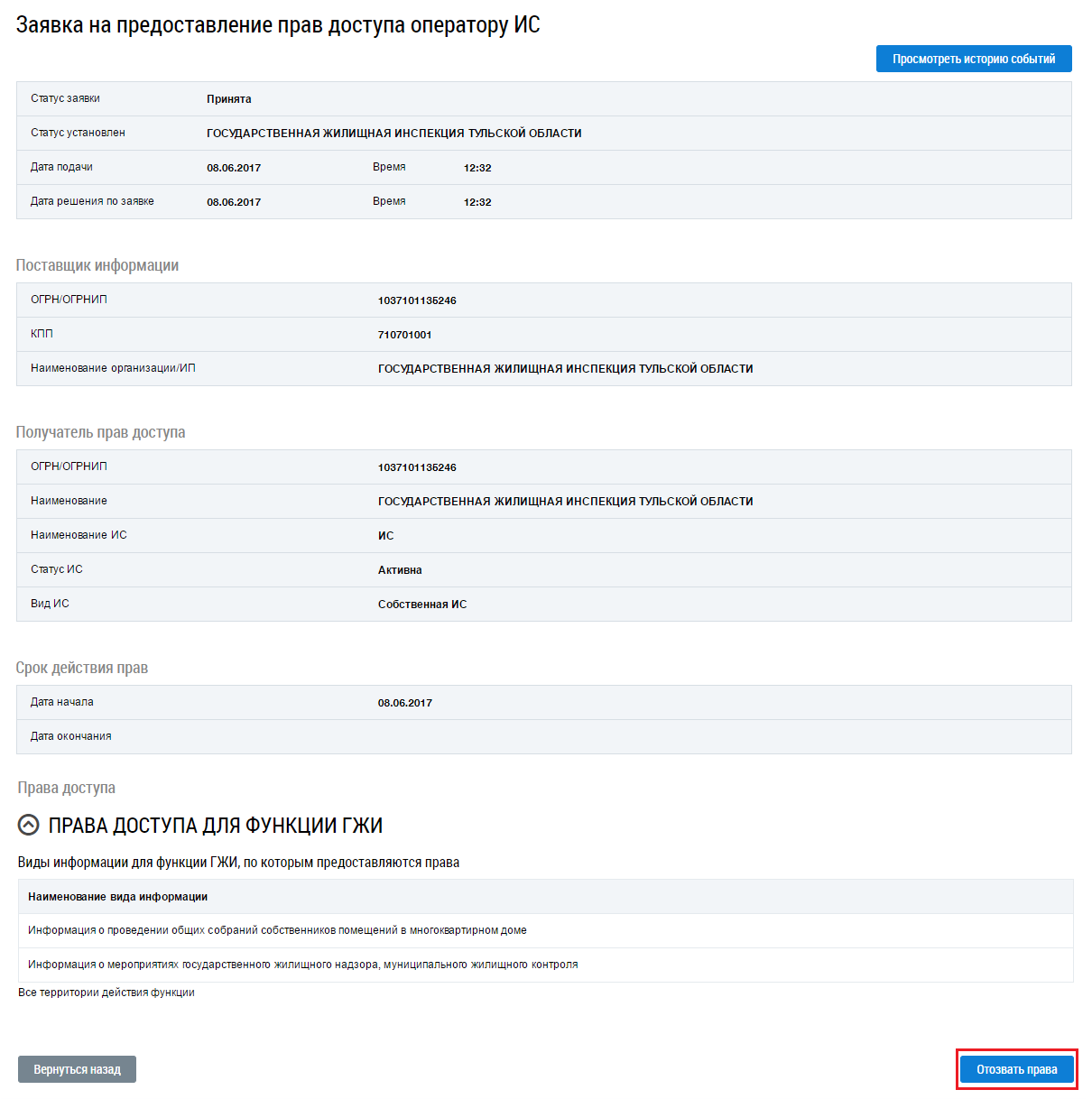 Рис. 1. Заявка на предоставление прав доступа в режиме просмотра, кнопка «Отозвать права»