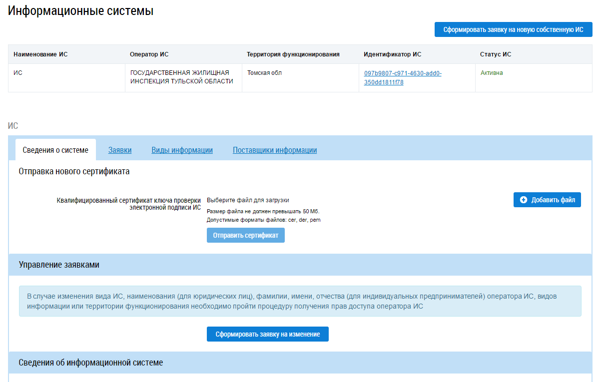 Работа с информационными системами: формирование и отзыв заявки на ИС, просмотр информации об ИС, отправка сертификата ключа.