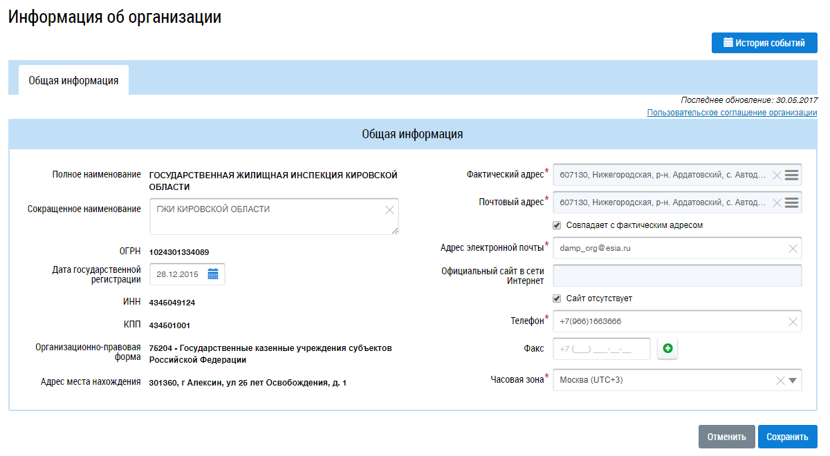 Часть полей на вкладке Общая информация заполнена данными, указанными при регистрации организации в ЕСИА. К этим полям относятся: