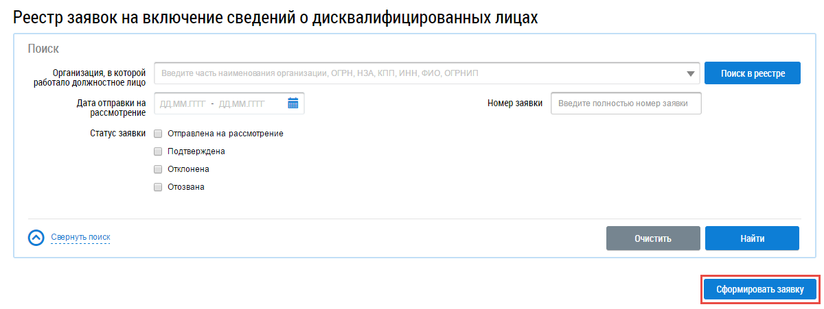 Для формирования заявки на включение сведений о дисквалифицированных лицах нажмите на кнопку Сформировать заявку на странице Реестр заявок на включение сведений о дисквалифицированных лицах.