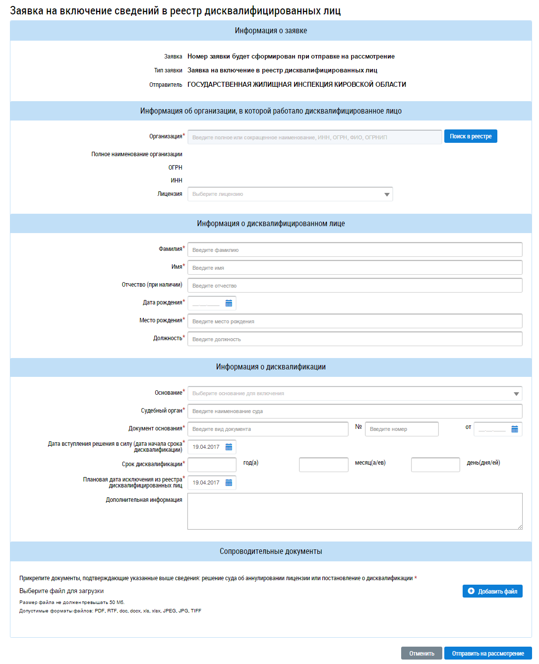 В отобразившемся окне (аналогично представленному на Страница «Заявка на включение сведений в реестр дисквалифицированных лиц») заполните обязательные поля, нажмите на кнопку Отправить на рассмотрение.